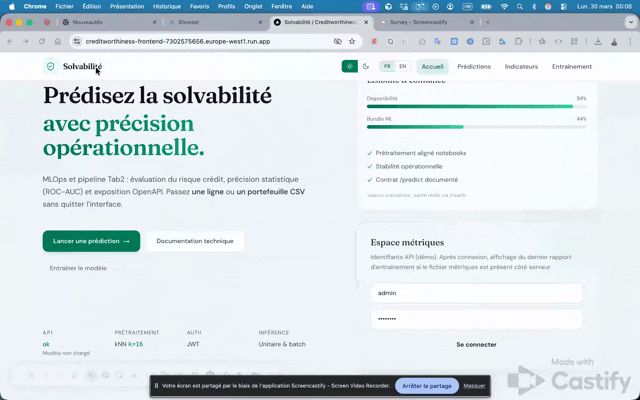 MLOps et pipeline Project Data : évaluation du risque crédit, précision statistique (ROC-AUC) et exposition OpenAPI. Passez une ligne ou un portefeuille CSV sans quitter l’interface.
